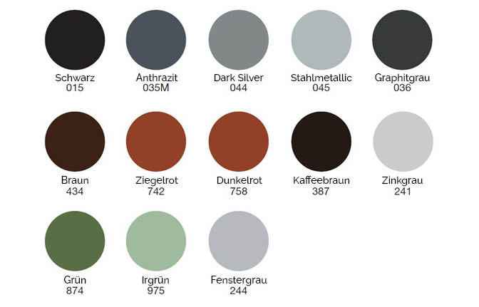 Schwarz, Anthrazit und Graphitgrau sorgen für eine klare und moderne Anmutung und eignen sich für zahlreiche Wohn‑ und Gewerbebauten. Hellere Nuancen wie Antikweiß, Hellgrau und Gänsewingengrau schaffen einen ruhigen und eleganten Ausdruck und werden häufig bei Fassaden eingesetzt, bei denen die Architektur leicht und ausgewogen wirken soll. Kräftigere Farbtöne wie Armeegrün, Ziegelrot oder Dunkelrot bieten die Möglichkeit, dem Fassadendesign Charakter und Wärme zu verleihen.